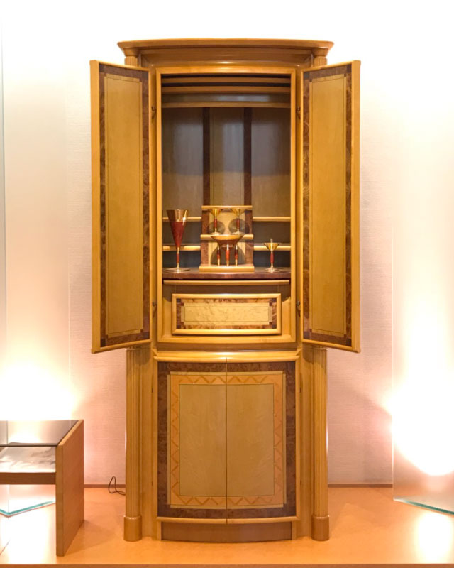 gendaiicon Published 2017年11月27日 at 640 × 800 in gendaiicon ← Previous Next → 現代仏壇 イタリア製 材質 バーズアイメープル・ウォールナット・カリン・メープル 高 156cm 幅 67・5cm 奥 53cm 象嵌が目に引く圧倒的な存在感。ドーリア式の柱やスポットライトの演出も高級感たっぷり。